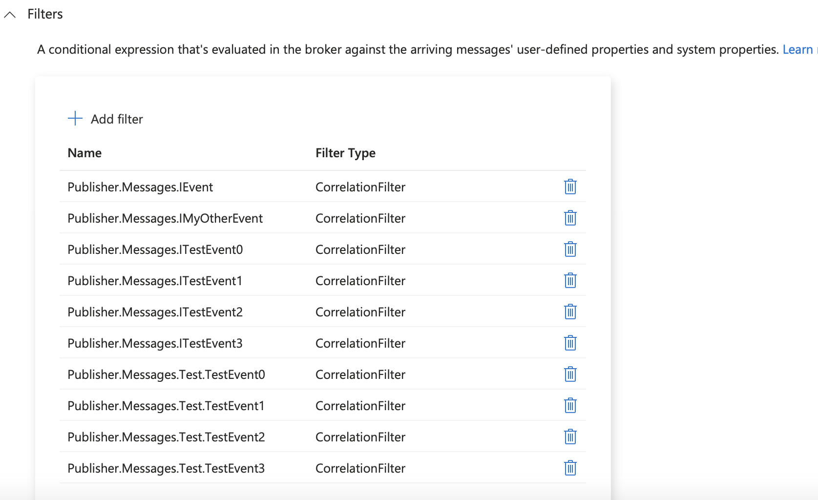 The Azure Service Bus transport configuration also does not allow us to extend the topology installation to provision these filters programmatically.